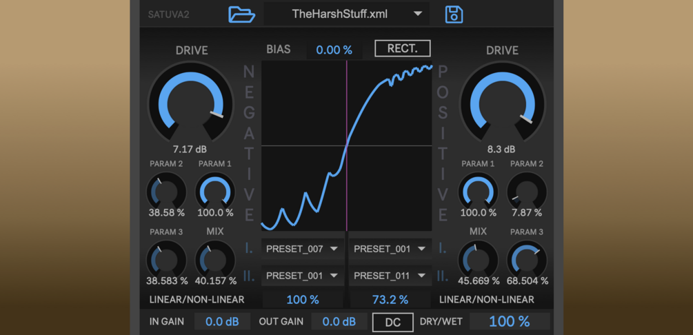 - Independent Saturation Control: Adjust the positive and negative sides of the saturation curve separately, with each side blending two different saturation types.